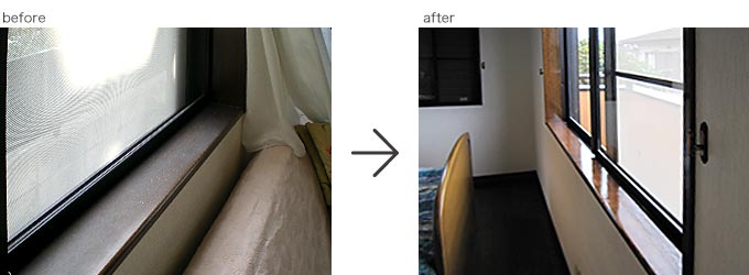 それを受け現場調色(トップページの「色がなかなか決まらない時は…?」参照)でカラーサンプル数色を建物に作成し決定!大変満足していただけました。劣化した室内の木枠も再着色後クリヤーで仕上げています。