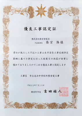 - 横須賀市優良工事認定(平成18年度、平成19年度、平成21年度、平成23年度、平成25年度の5回受賞)