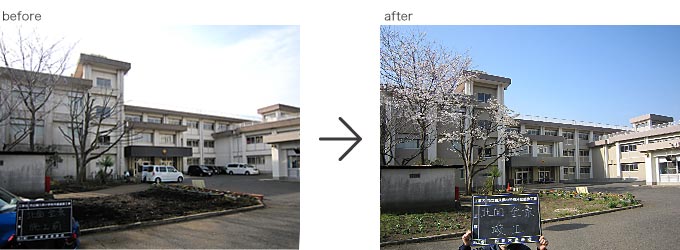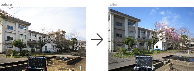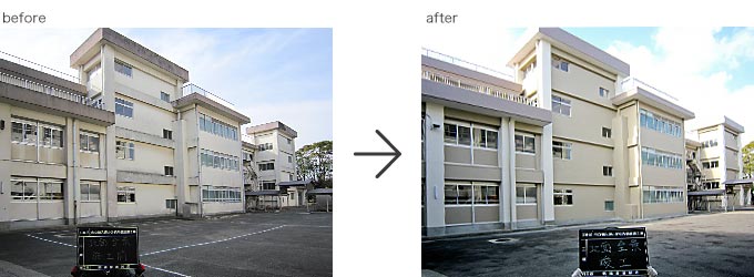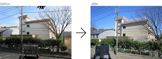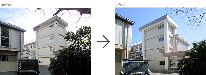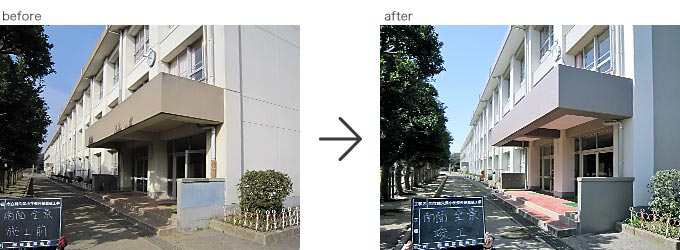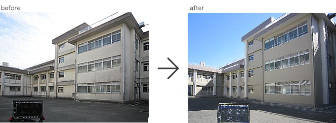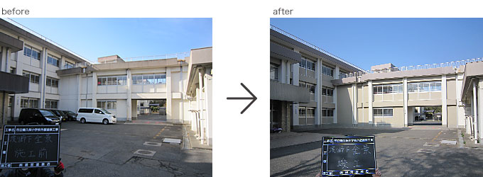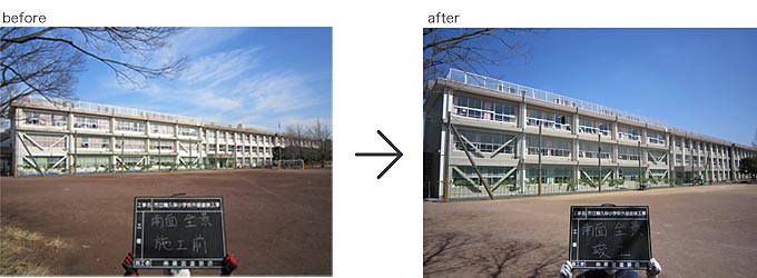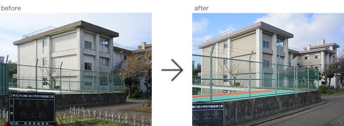 2013.3月完成 ○横須賀市立鶴久保小学校 校舎をぐる~り一周すると約300m。 その建物40%程度の劣化した塗膜を全て除去し、下地調整後、校舎全体を防水塗装施工。