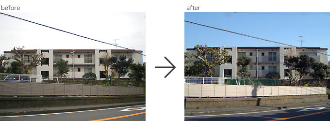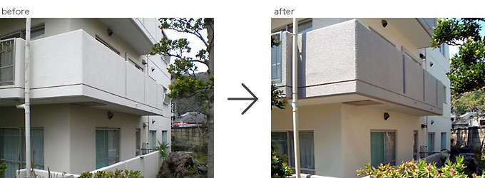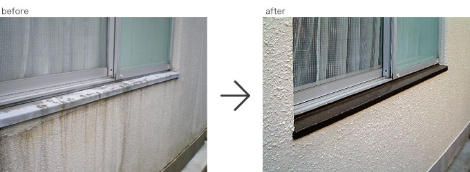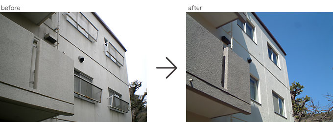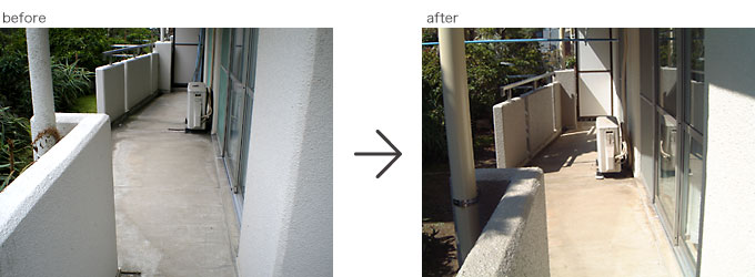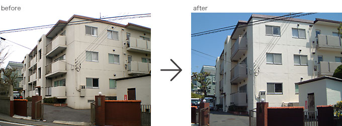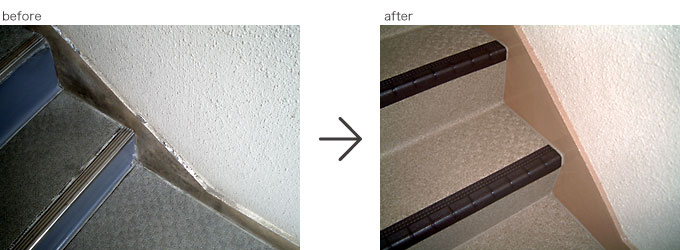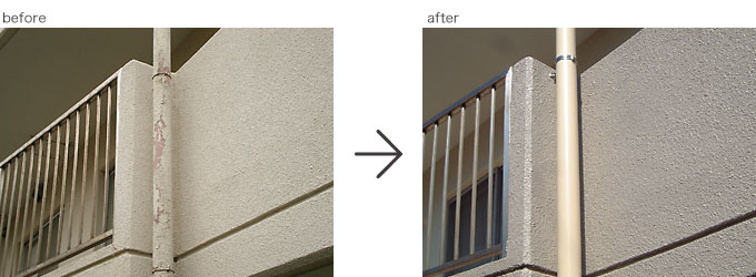 この事例は戸建て住宅ではありませんが、今回2回目の改修工事で15年ほど前からのお客様です。雨とい取り替え、階段室防滑性ビニル床シート張り替え施工。