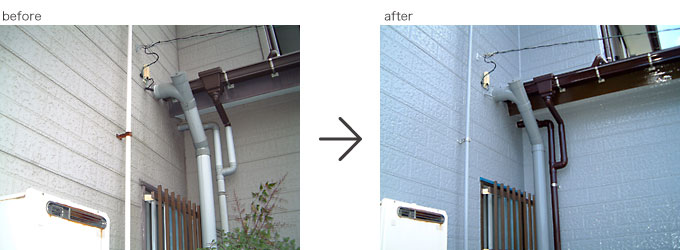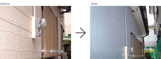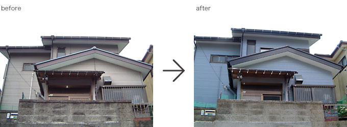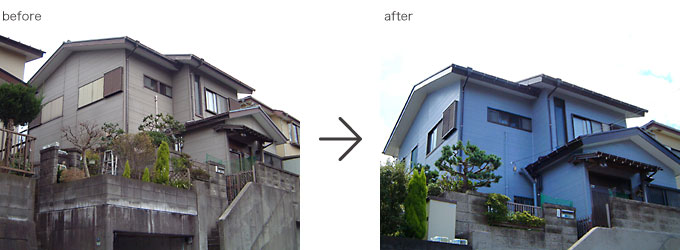 外壁はブルーグレー色仕上げ。屋根はカラーベストの劣化が進んでいたため、野地板および下地にも手を加え、張り替え。