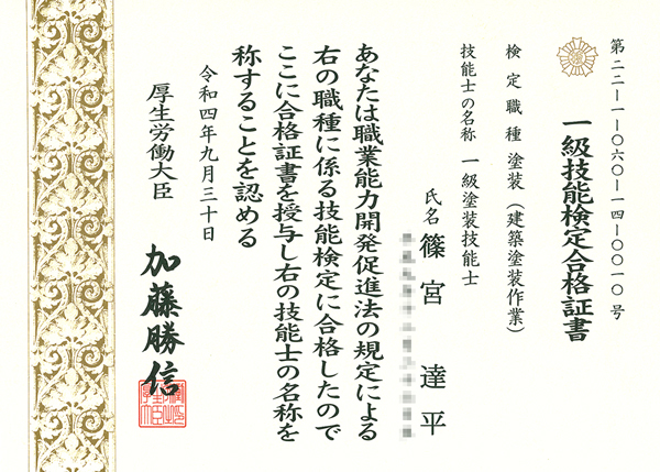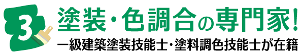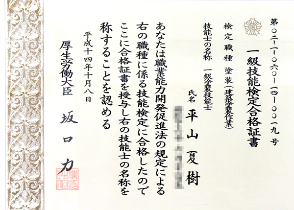 一級塗装技能士とは、国家資格である技能検定制度の一種で、塗装に関する学科及び実技試験に合格した者をいいます。色の調合や各塗料の特性を熟知し、複雑かつ繊細な塗り方が出来る塗装のプロが一級塗装技能士。全国でも数少ない選ばれた塗装のスペシャリストです。