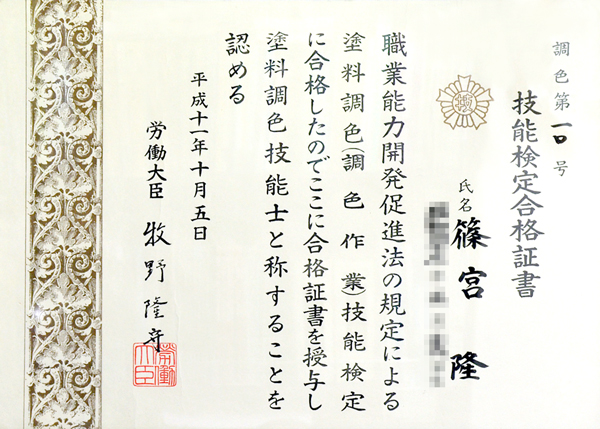 塗料調色技能士とは、色の調合だけに特化した技能検定制度で、これも国家資格です。